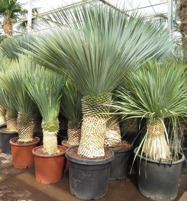 Immergrüne, Stammbildende, sich selten verzweigende Palmlilie mit baumförmigem Wuchs bis ca. 4,5m mit langen, starren Blättern (ähnlich Yucca rostrata, jedoch mit breiteren, eher bläulichen Blättern) und bis zu 1,7m langen, aufrechten Blütenständen, bestehend aus kleinen, runden oder glockenförmigen, weißen Blüten.